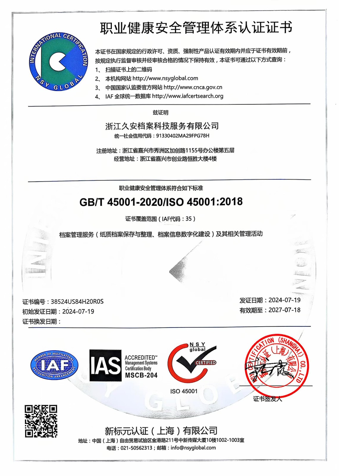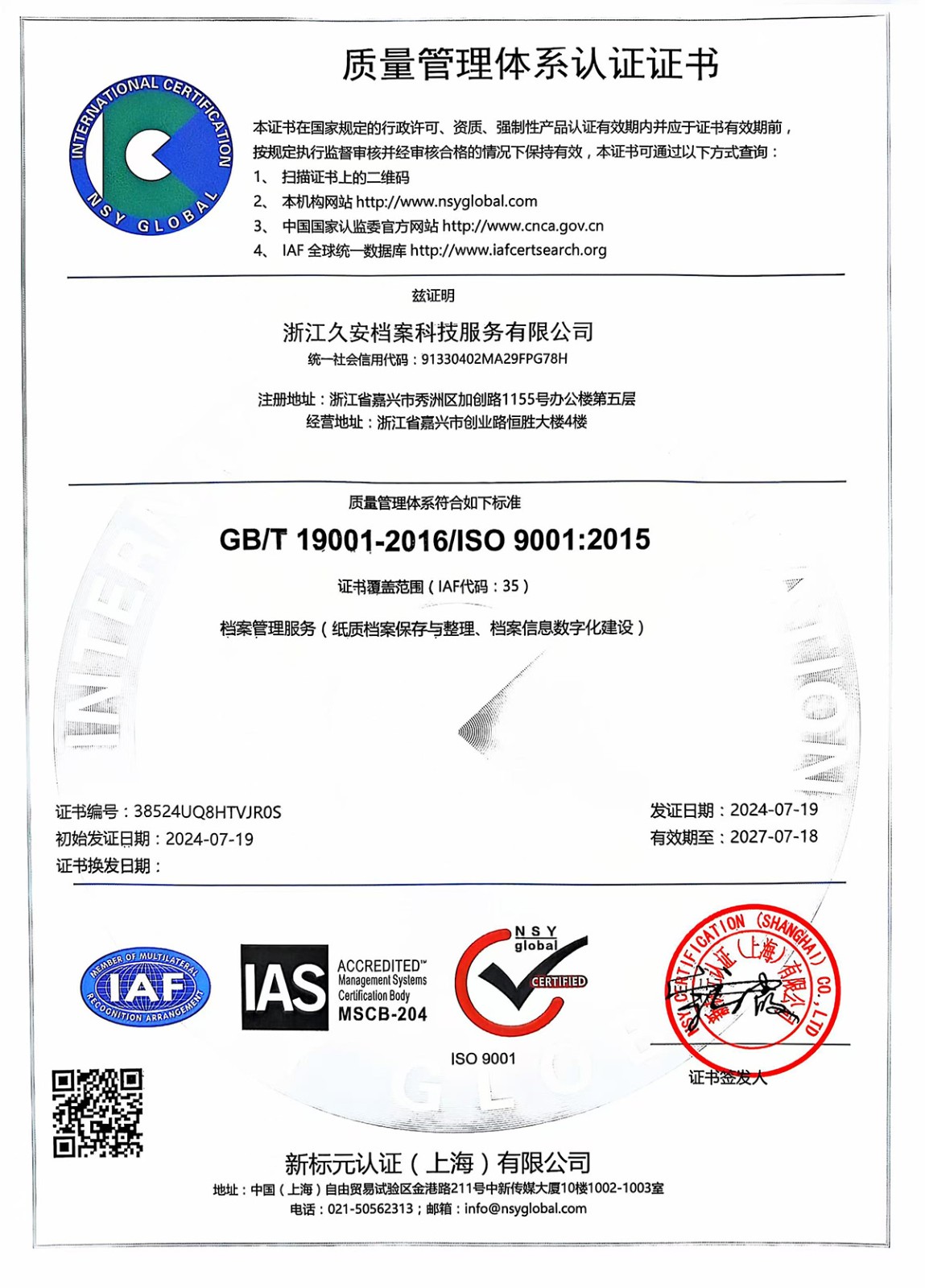 浙江久安档案科技服务有限公司于2017年5月正式成立,是由浙江中铭会计师事务所等团队发起组建的专业档案服务提供商,注册资本1000万元。公司秉承“专业、高效、优质、快捷”的宗旨为各机关、团体、企事业单位提供档案相关的各类专业服务。经过近些年的蓬勃发展公司取得了优异的成绩,先后荣获嘉兴市档案服务业协会会长单位、嘉兴市档案学会理事单位等殊荣,并吸引大量人才加盟,通过了质量管理体系认证(ISO9001:2015标准)、环境管理体系认证(ISO14001:2015标准)和职业健康安全管理体系认证(ISO45001:2018标准)。
