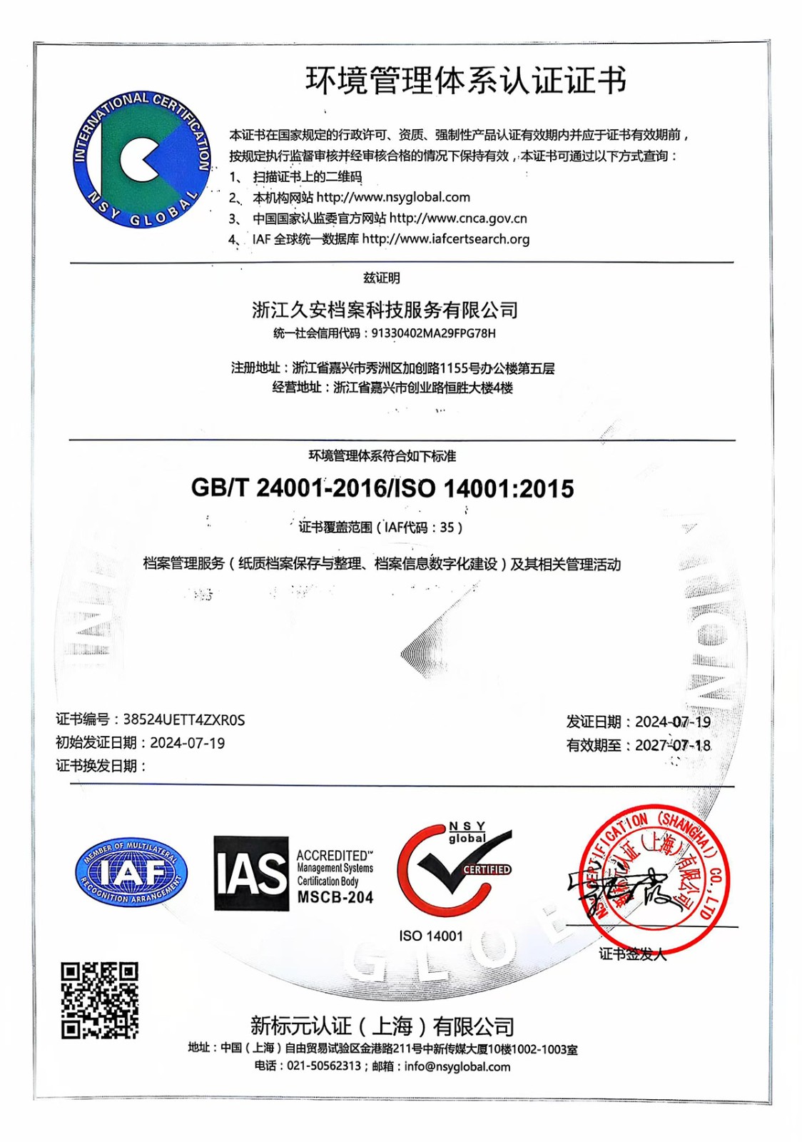 自2017年久安档案成立以来不断推进档案管理设备升级,着力扩大寄存服务规模,努力提高档案管理人员水平,积极加强档案馆管理工作,深入贯彻落实档案法的各项要求,在档案管理领域精益求精。通过权威认证部门层层审核,荣获ISO9001质量管理体系、ISO14001环境管理体系、OHSAS18001职业健康安全管理体系认证。